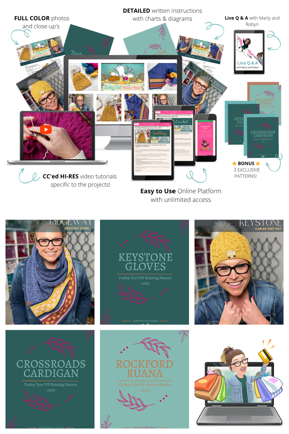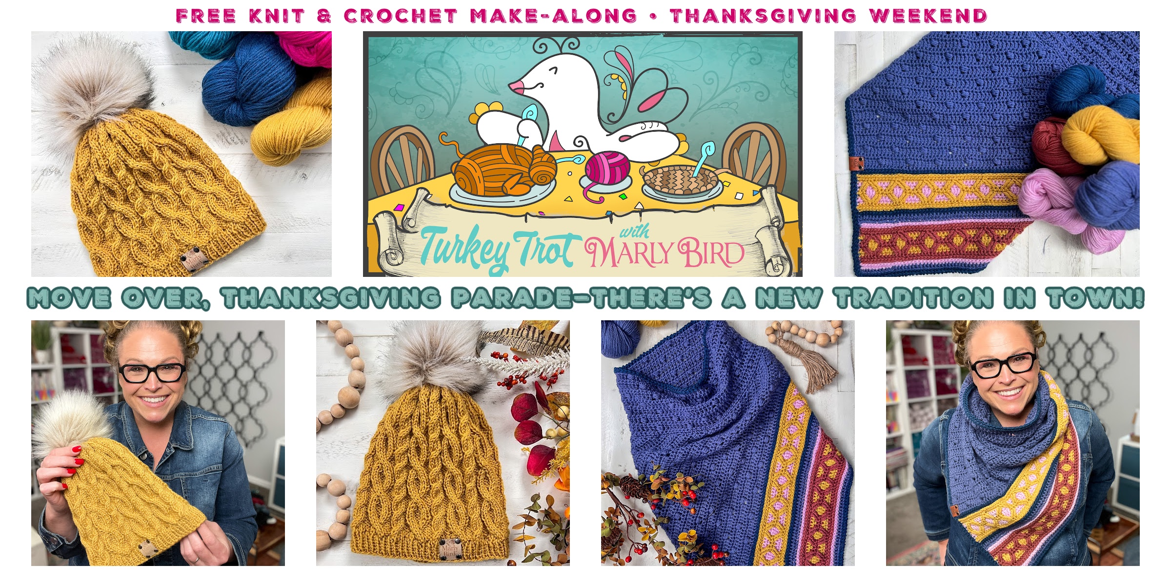 Turkey Trot Mystery Make-Along with Marly Bird 2025 is a super fun online event held over the US Thanksgiving weekend for BOTH knitters and crocheters.